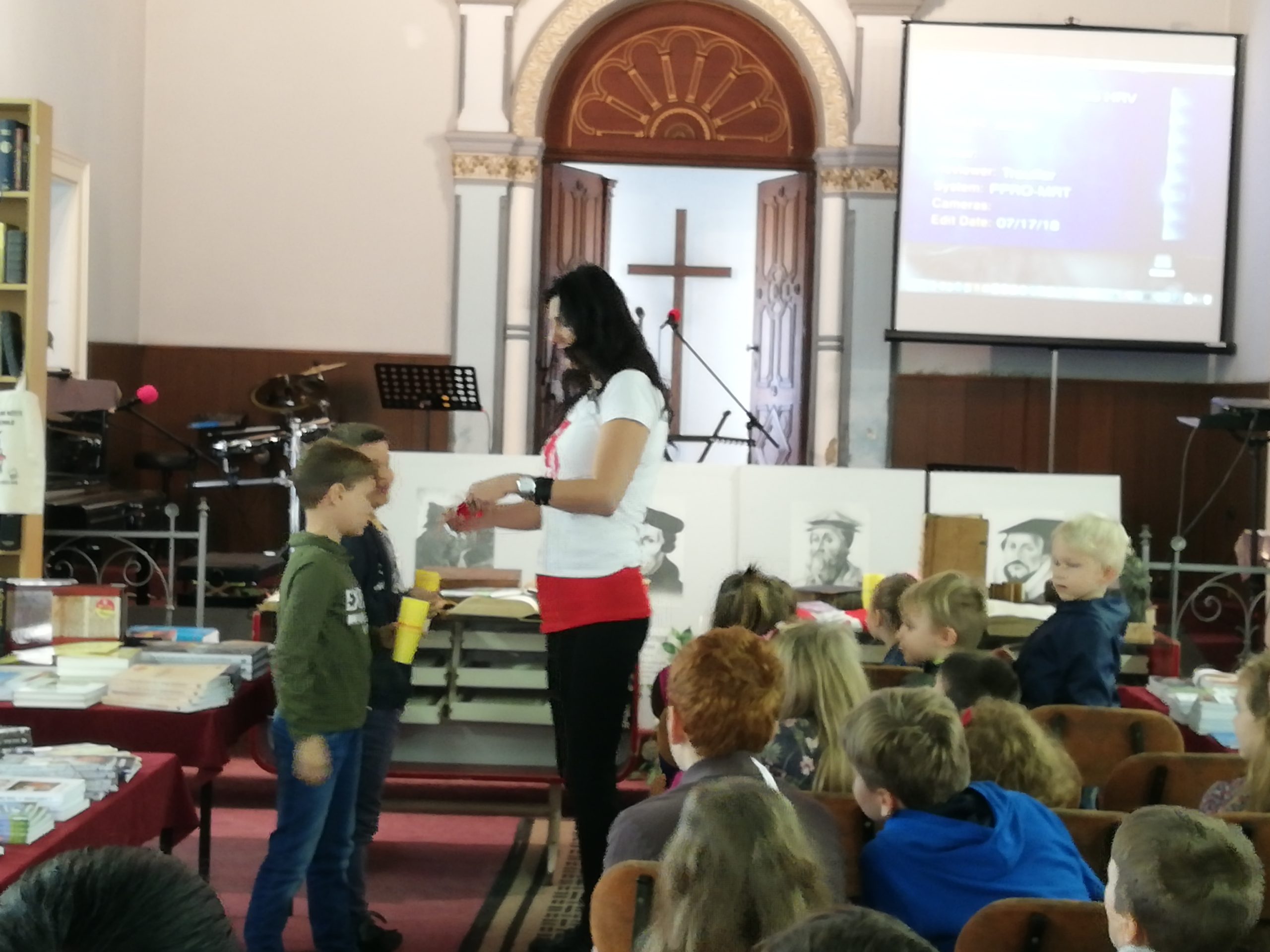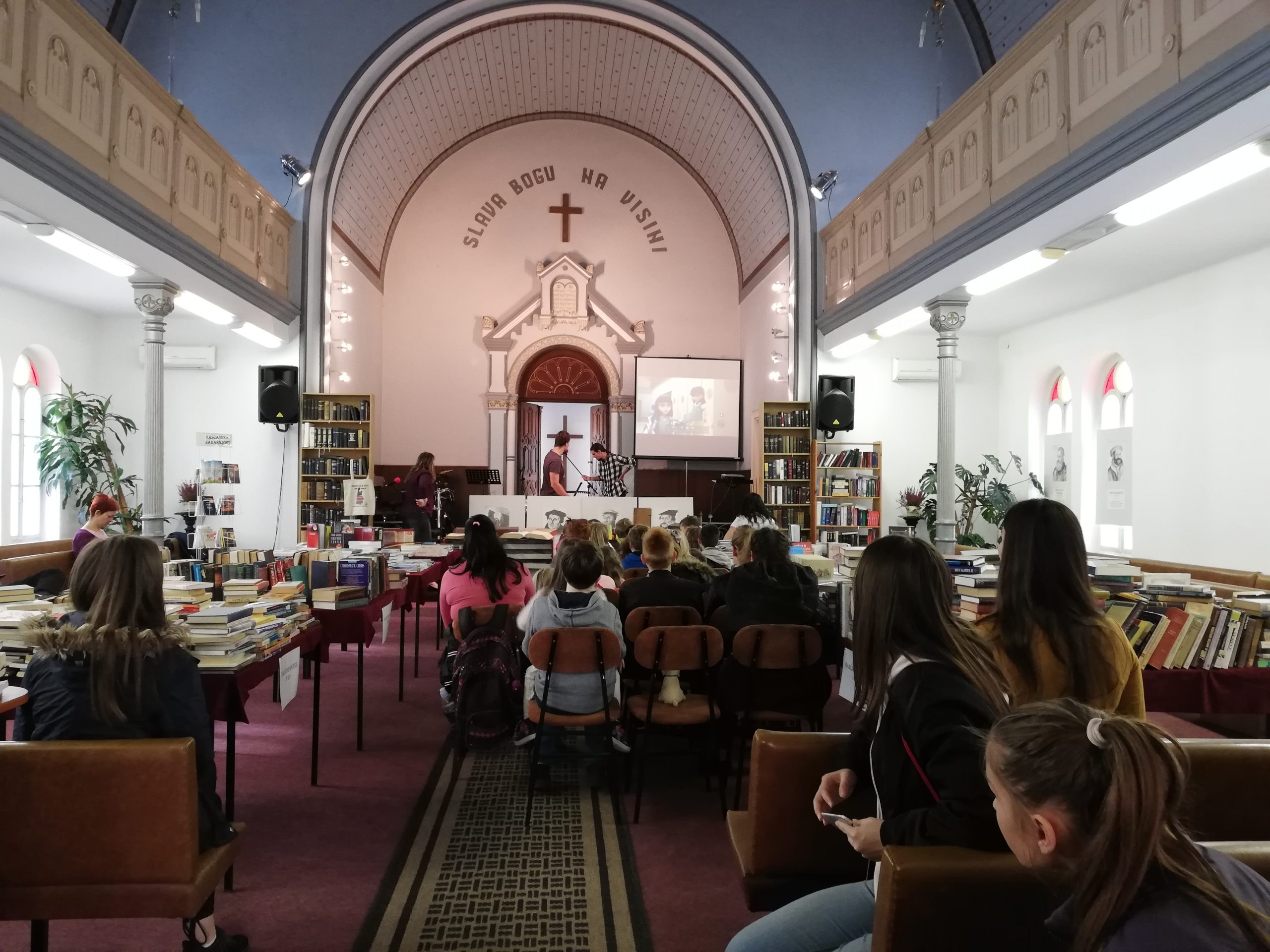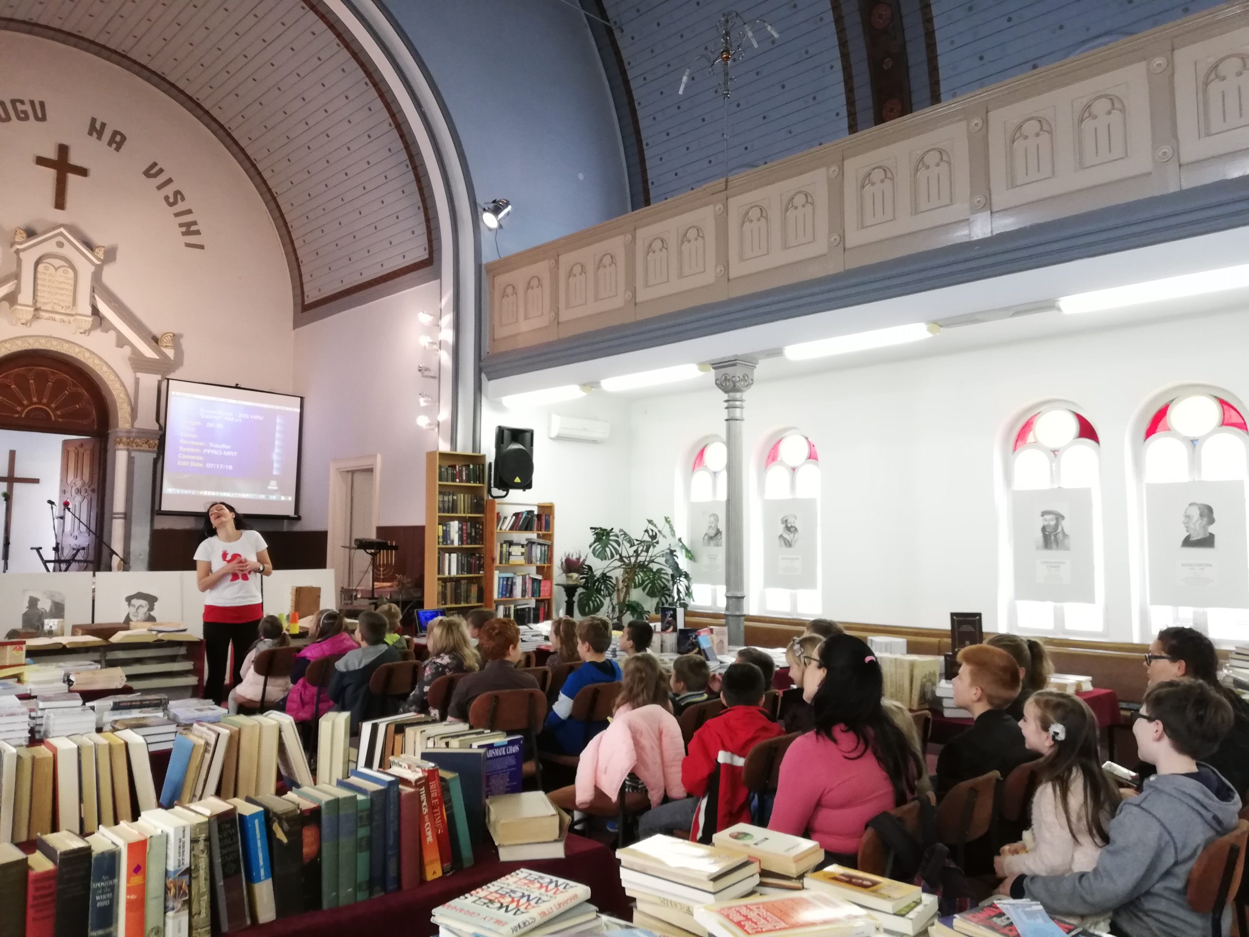Idućega dana, u nedjelju, posjetili smo Evanđeosku crkvu u povijesnoj građevini u centru Osijeka – bivšoj sinagogi. Upravo u tom tjednu održavala se manifestacija „Tjedan kršćanske knjige”, koja se tradicionalno održava u Osijeku u povodu Dana reformacije, 31. listopada, te smo na licu mjesta mogli prelistati neke od najstarijih primjeraka Biblije koji datiraju još iz 16. i 17. stoljeća. Uz to, na izložbi se moglo naći više tisuća naslova raznih kršćanskih izdavačkih kuća iz Hrvatske. U tom prostoru dočekalo nas je 40ak djece uzrasta 7 do 14 godina koja su se rado poigrala s nama, pogledala jednu od Superknjiga epizoda te se na kraju slikala s Gizmom.