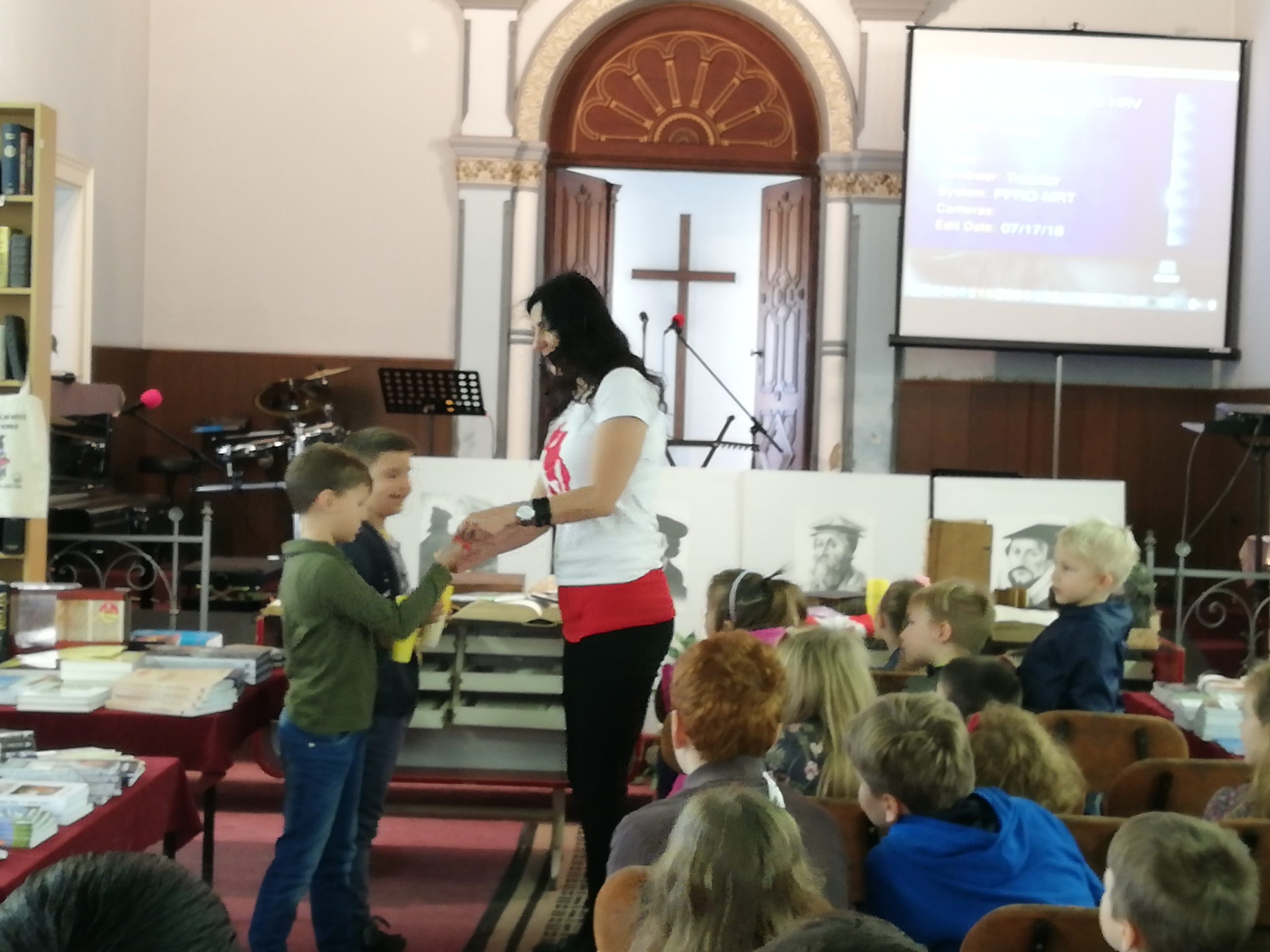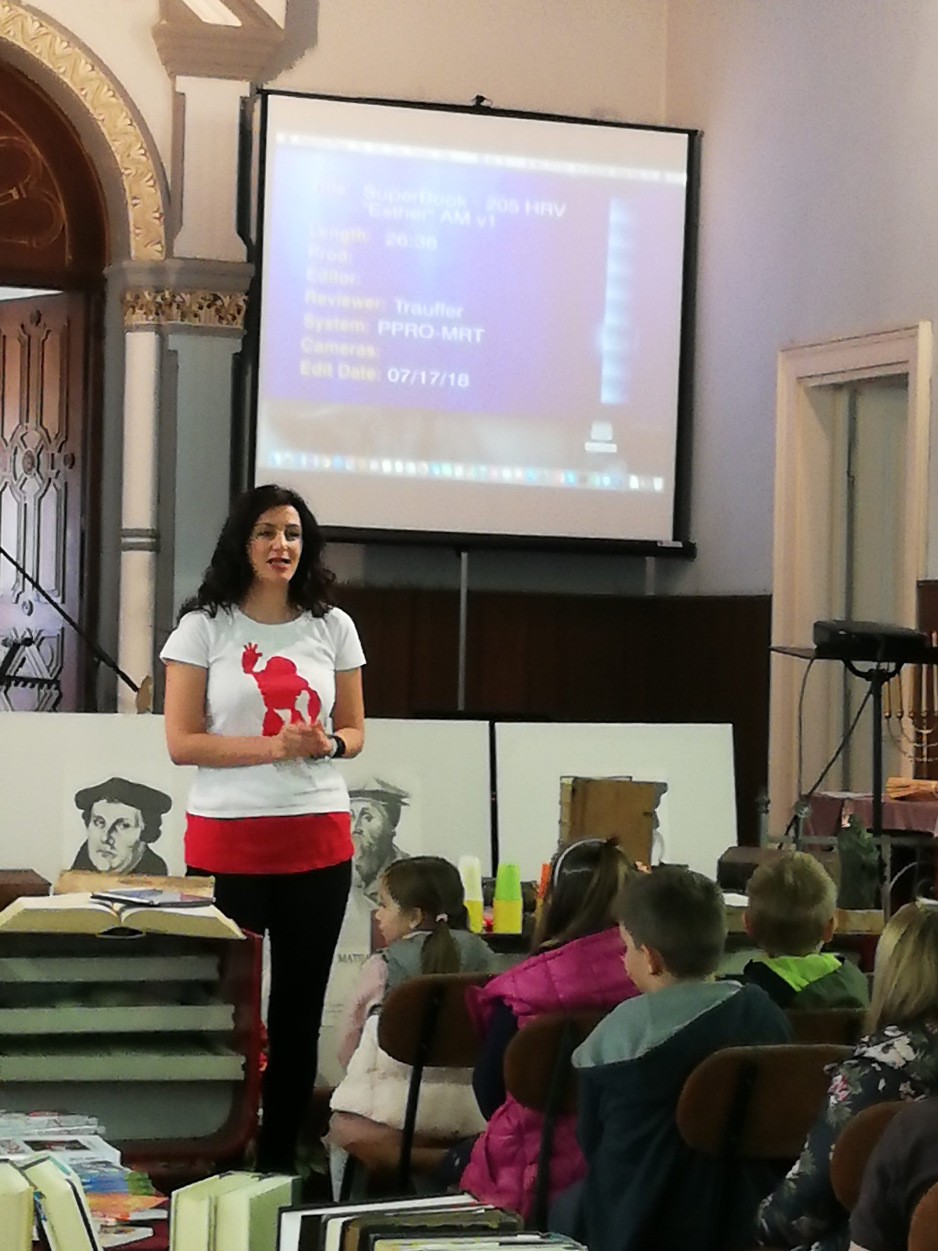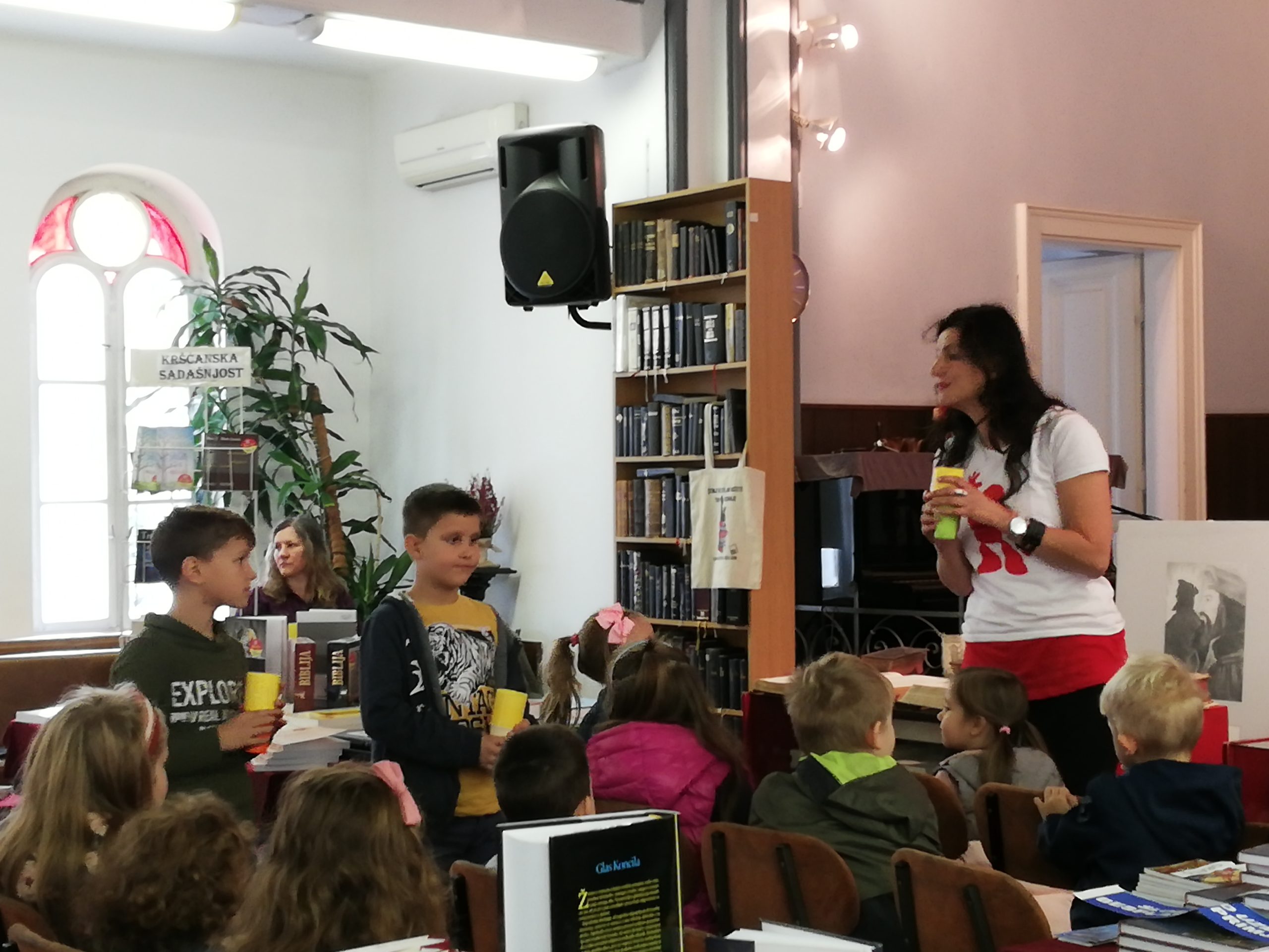 Idućega dana, u nedjelju, posjetili smo Evanđeosku crkvu u povijesnoj građevini u centru Osijeka – bivšoj sinagogi. Upravo u tom tjednu održavala se manifestacija „Tjedan kršćanske knjige”, koja se tradicionalno održava u Osijeku u povodu Dana reformacije, 31. listopada, te smo na licu mjesta mogli prelistati neke od najstarijih primjeraka Biblije koji datiraju još iz 16. i 17. stoljeća. Uz to, na izložbi se moglo naći više tisuća naslova raznih kršćanskih izdavačkih kuća iz Hrvatske. U tom prostoru dočekalo nas je 40ak djece uzrasta 7 do 14 godina koja su se rado poigrala s nama, pogledala jednu od Superknjiga epizoda te se na kraju slikala s Gizmom.